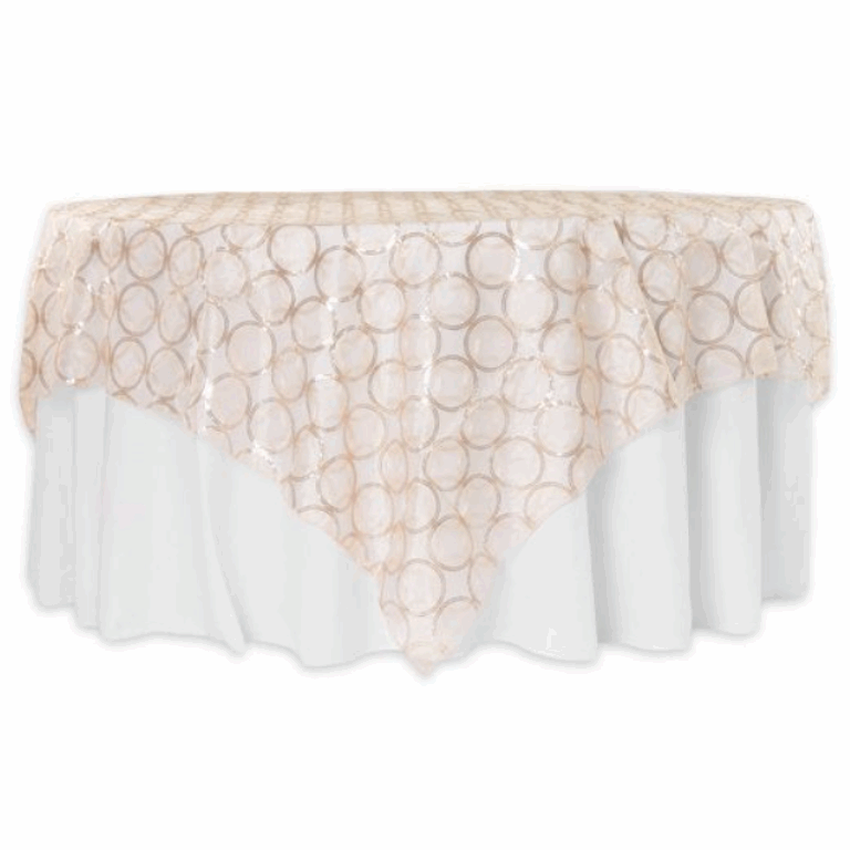 Our Circle Sequin Overlays with their subtle touch of sequined geometric circles are perfect draped over any opaque tablecloth to make a statement at weddings, baby showers, or any other special occasion. Constructed of fine, sheer organza hand-embroidered with interlocking circles and intermittent sequined details they add a touch of opulence to your tablescape.